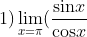Type in: lim [ x = π ] ( sin x / ( cos x + 1 ) )